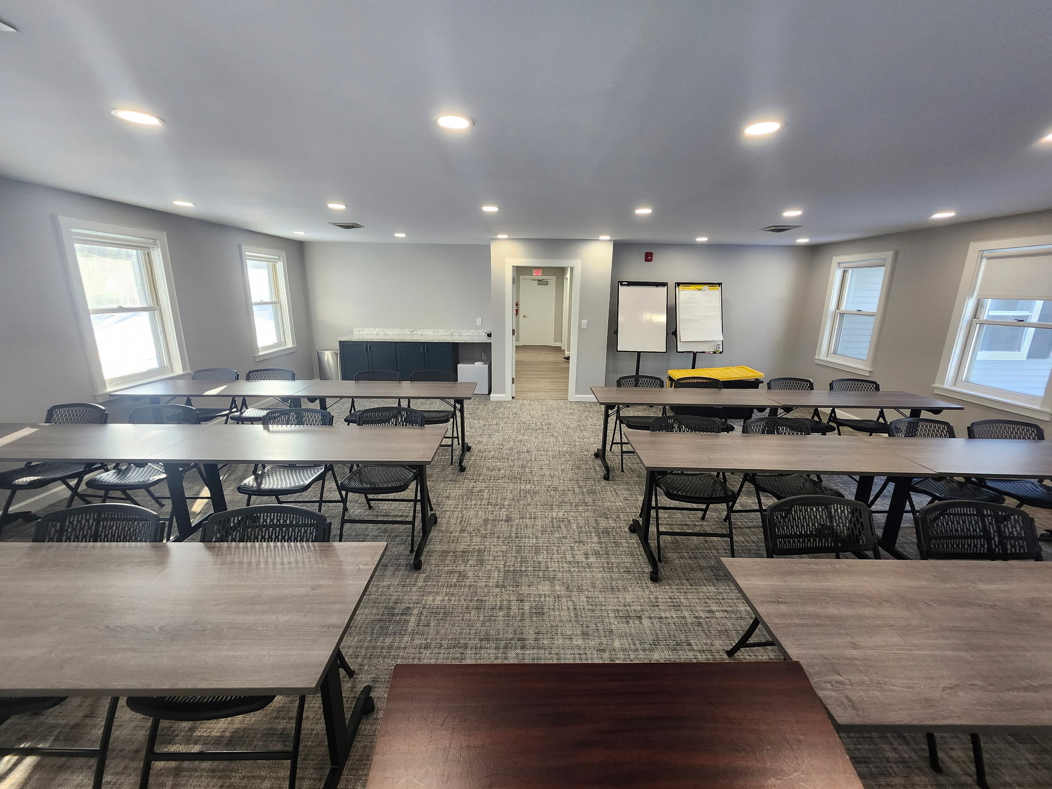 Arranged theater-style, this configuration is ideal for presentations, panels, and community forums. With seating for up to 64 and built-in AV capabilities, it’s designed for large-group engagement. If you are hosting an event and would like to bring in catering, there is a countertop available for setup. The Event Center has ample natural light and a beautiful view of the woods on three sides.