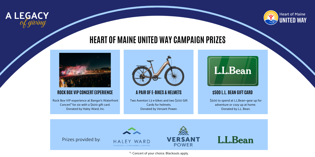 No purchase necessary. Entries must be received by December 29, 2025 at 4 PM. Entries into the Heart of Maine United Way sweepstakes are eligible to win: A Bangor Waterfront Concert Rock Box VIP Experience for 6 and a $600 gift card) provided by Haley Ward, Inc.; a mystery prize donated by Versant Power, a $500 L.L. Bean gift card from L.L. Bean. Once drawn, the winner of the 1st prize is not eligible for the 2nd prize or 3rd prize. Once drawn, the winner of the 2nd prize is not eligible for the 3rd prize.
